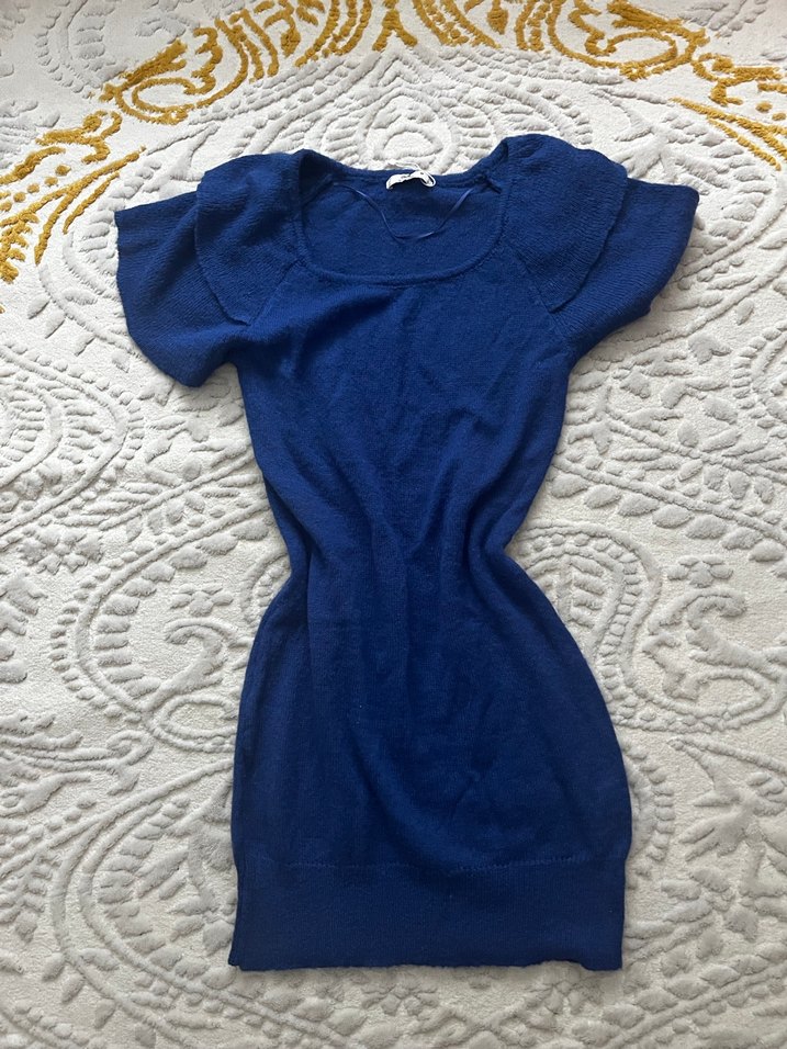Kadınlar için kısa kollu, triko dokuma, yumuşak keten kumaştan, midi boy lacivert elbise. Günlük kullanıma uygun, sade ve rahat bir model.