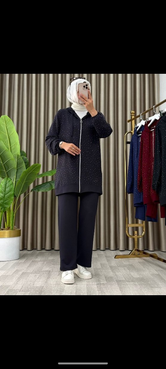 Siyah renkli, triko kumaştan kadın eşofman takımıdır. Uzun kollu, kesimli yaka ve rahat kesimiyle günlük kullanıma uygundur. Minimalist ve şık tasarıma sahiptir.