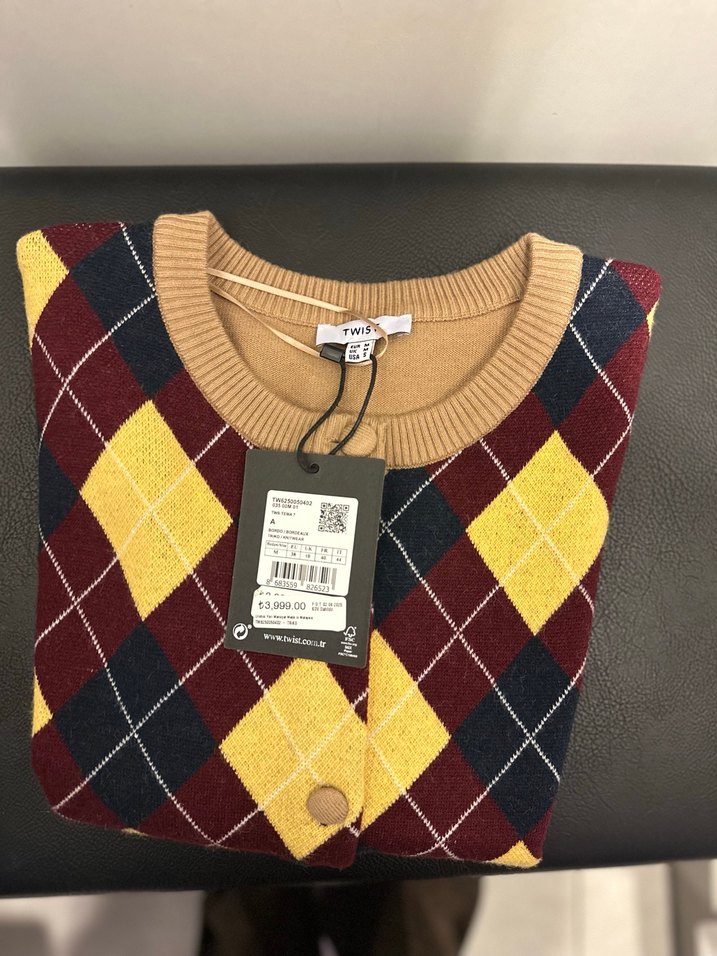 Bu kadın hırka, triko yün kumaştan, yuvarlak yaka ve uzun kolludur. Gevşek kesimi ve koyu kahverengi, sarı, lacivert desenli argyle baskısı vardır. Günlük kullanıma uygundur. Bir kez giyeim etiketsizz