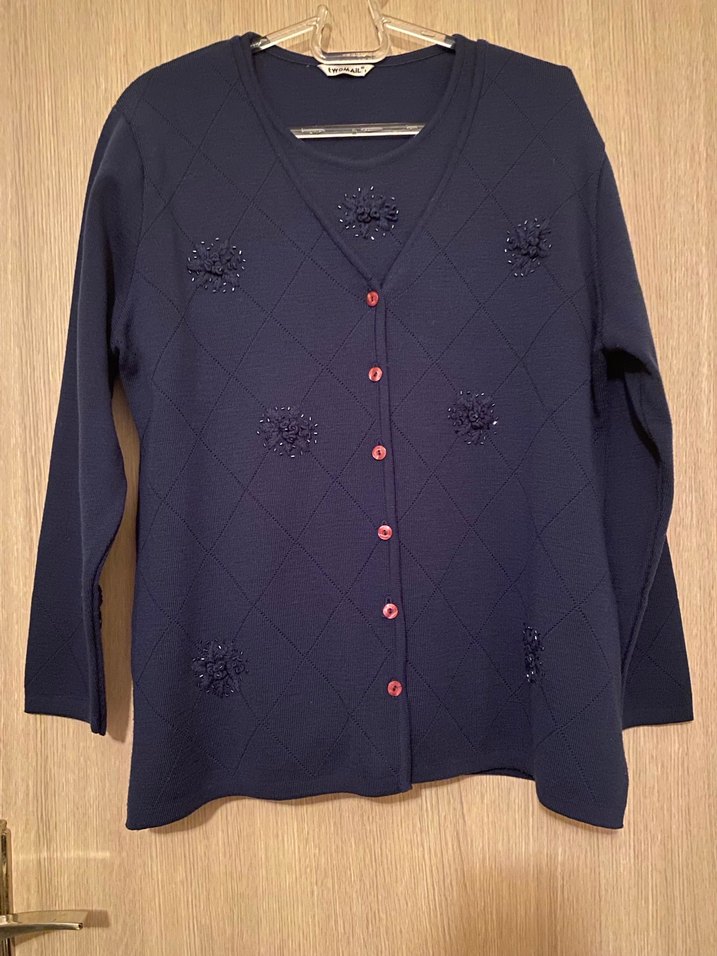 Mavi renkli, düğmeli, uzun kollu, notched lapel yaka detaylı, bol kesim triko hırka ve yarım kollu kazak. Üzerinde pullu çiçek desenleri var. Kışlık kalın ve rahat lacivert bir takım. Az giyildi. Temiz sorunsuz hasarsız. Oldukça şık. TwoMail marka. En 54cm, boy 64 cm