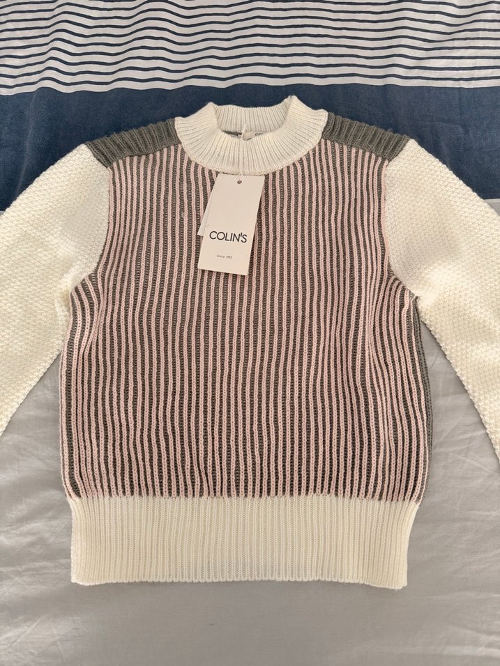 Bu Colin's marka kadın kazak, bisiklet yaka ve uzun kolludur. Triko dokusu, çizgili pembe ve gri desen ile beyaz kollara sahiptir. Günlük rahat ve şık sokak stiline uygundur.