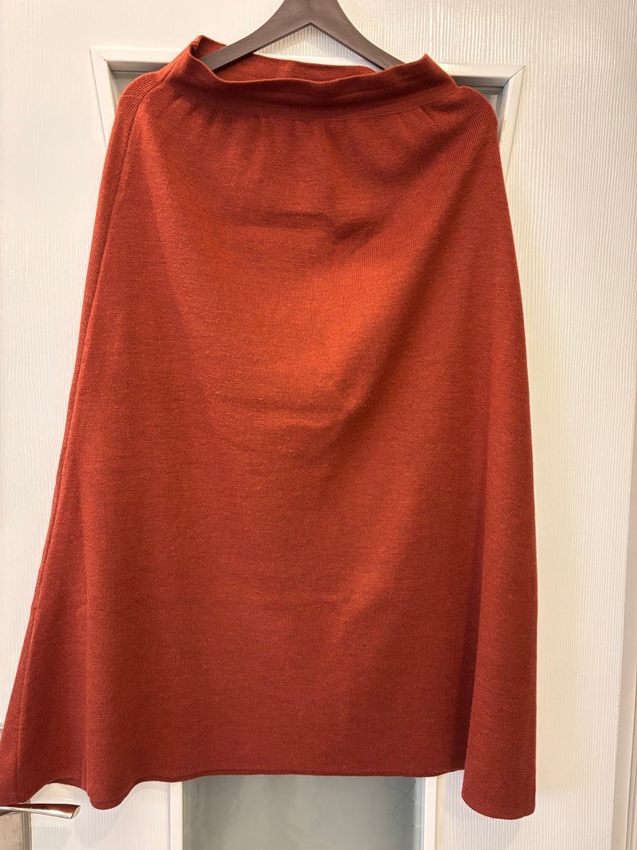 Standart beden Beli lastikli, lastiğin esnememiş hali 33 cm, esnemiş hali 43 cm Uzunluk 87 cm Basen 56 cm Kadınlar için kiremit tarçın renkte, triko kumaştan yapılmış, midi boyda, beli lastikli, A kesim bir etektir