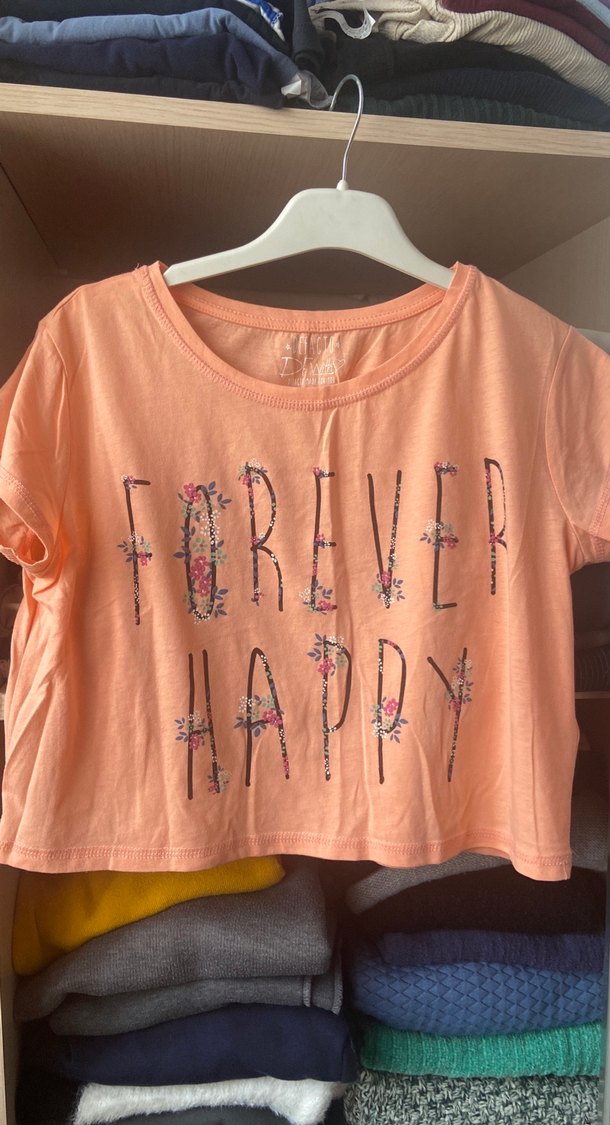 Pembe, kısa kollu, yuvarlak yakalı crop. Floral baskılı "FOREVER HAPPY" yazısı ve bol kesimi ile rahat bir stil sunar.