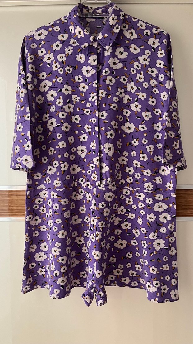 Ürün boyu: 78 cm Mor çiçek desenli, kısa kollu, yakalı ve düğmeli kadın tulumu. Rahat kesimli ve yumuşak viskon kumaştan.