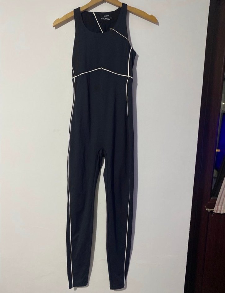 Bu siyah kadın tulumu, yüksek yakalı ve kolsuz tasarıma sahiptir. Sentetik kumaştan üretilmiş, beyaz çizgili sade bir görünüme sahiptir. Spor ve sokak stili için uygundur. Hiç giyilmedi