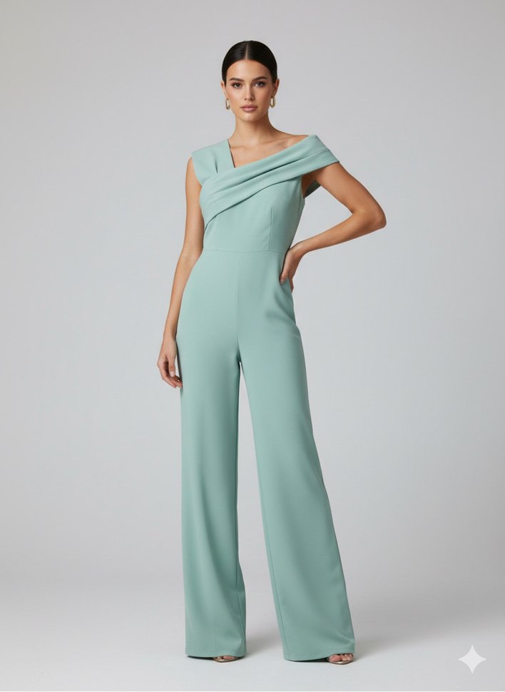 Turkuaz renkte, kolsuz V yakalı, uzun ve regular fit kesime sahip sentetik kumaştan tulum. Minimalist tarzda, düğünler için uygun. İki kol arası 47 cm Boy 157 cm Bel çizgisinden parça sonuna kadar boy 115 cm 40 bedendir Bir gece giyilmiş çok şık bir tulumdur