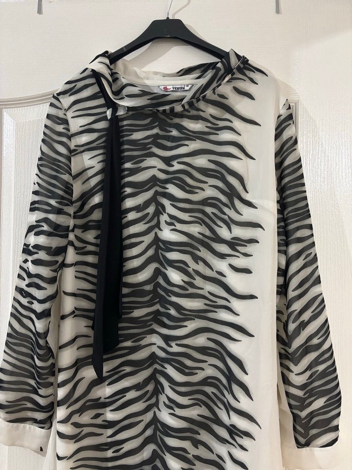Kadınlar için uzun kollu, bol kesim ve yüksek yakalı tunik. Gri zebra desenli, sentetik kumaştan, kürk detaylı, sokak stili ve günlük kullanım için uygun.