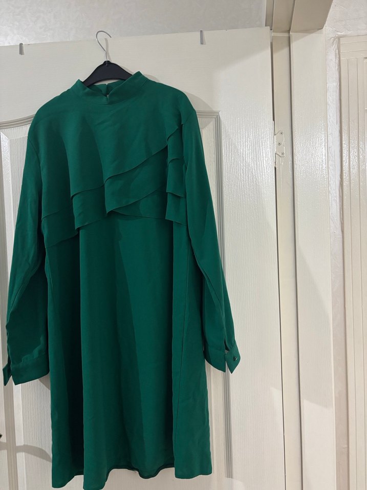 Keten kumaştan, yüksek yakalı, uzun kollu ve salaş kesimli koyu yeşil kadın tunik. Dökümlü tasarımıyla günlük ve sade sokak stiline uygundur.