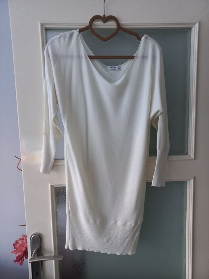 Pamuk kumaştan yapılmış,kırık beyaz renkli, kayık yaka ve uzun kollu tunik&bluz.Esnek kumaş ve yumuşacıktır.1 kere giyildi.Dolapta dururken diğer kıyafetlere değdiği için çekme gibi bişeyler olmuş.Son 2 resimde göstermeye çalıştım.Bunu bilerek alınız.M/L bedene göredir.