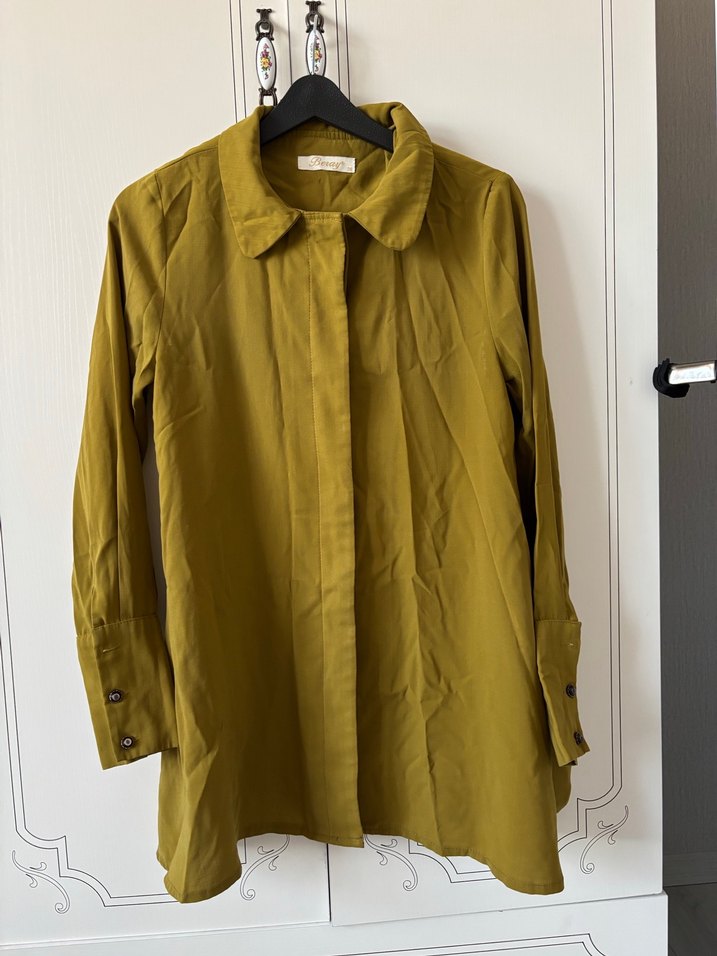 Yağ yeşili tunik gömlek. İki yanında cepleri var ve herhangi bi kusuru yok. Sadece en altta bi tane düğmesi eksik. Düğme dikilebilir. Kumaşı kaliteli bi kumaştır