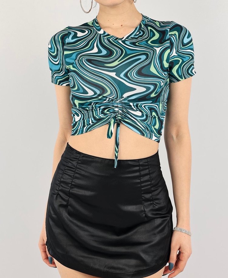 Dar kesim kadın bluz, koyu turkuaz bağlama desenli, kısa kollu ve V yakalıdır. Mini boy, pileli ve belde bağcıklı, sentetik yumuşak kumaştan yapılmıştır. Sokak stili için uygundur.