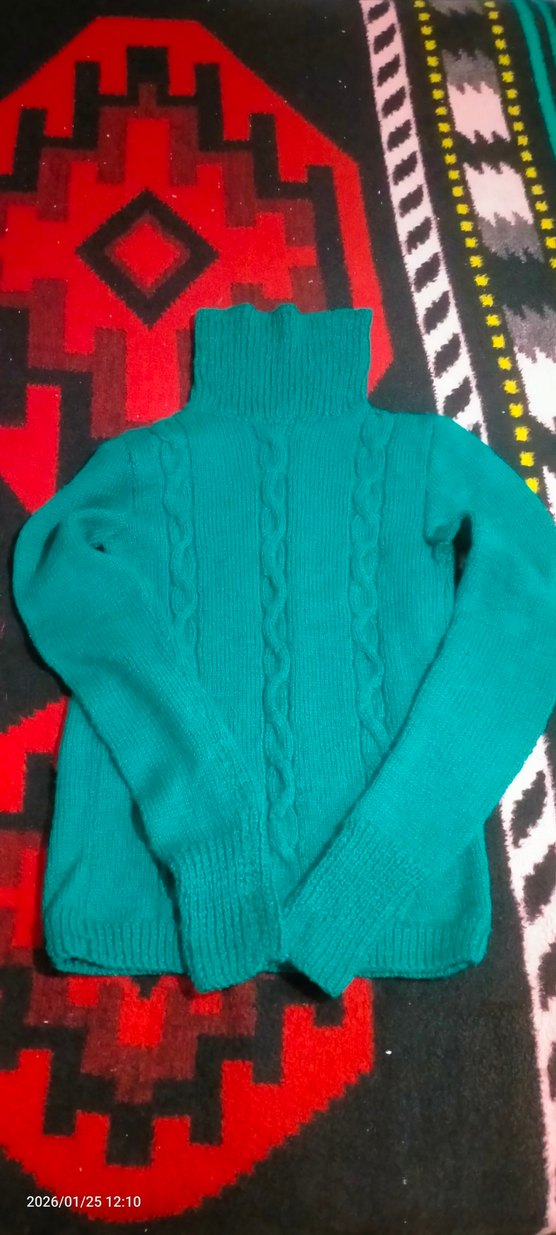Turkuaz renkli, balıkçı yaka ve uzun kollu, örgü kumaştan yapılmış, rahat ve renkli kadın kazak. Günlük kullanım için uygundur.