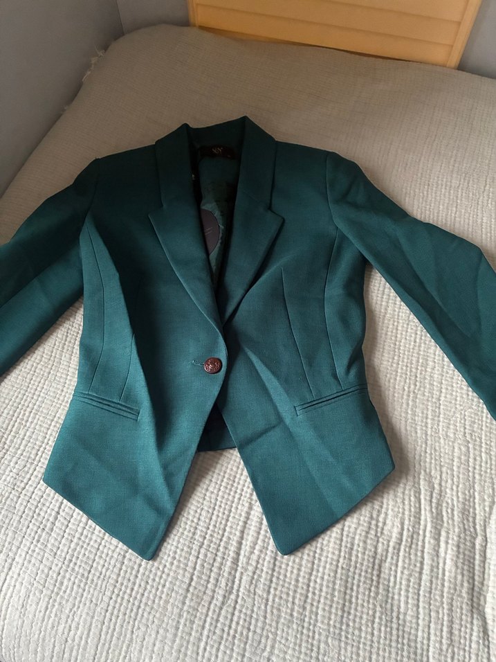 Düğmeli, uzun kollu, turkuaz kadın blazer. Modern klasik tarzda, ipeksi dokulu, ofis için uygun.