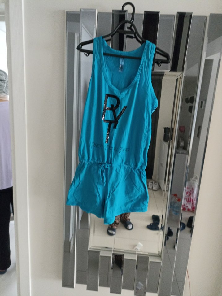 Kemer detaylı, baskılı, parlak mavi renkli, kolsuz ve bol kesim kısa tulum, sentetik kumaştan, spor ve sokak stiline uygun.