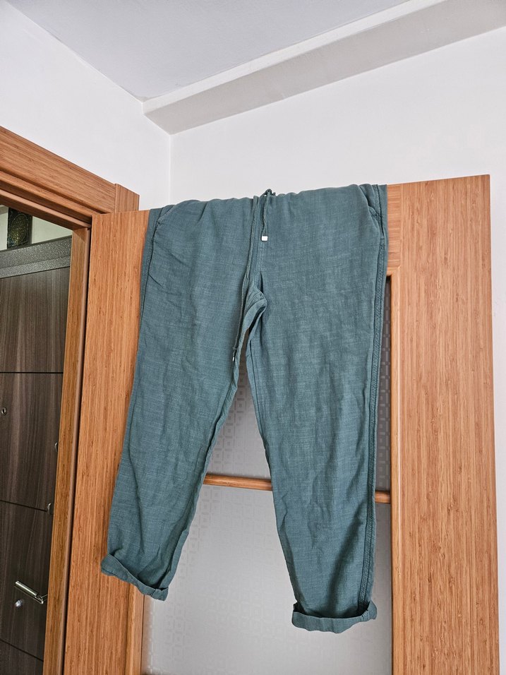 Kadınlar için çimen yeşili keten kumaştan, beli kuşaklı bol kesim midi boy pantolon. Günlük rahat kullanıma uygun, desensiz ve normcore tarzında.