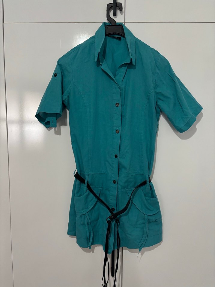 Turkuaz renkli, keten kumaştan kadın kısa kollu ve yakalı, bol kesim tunik. Bel kemeri ile günlük kullanıma uygun rahat bir model.