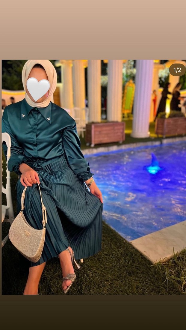 Kadınlar için uzun, yakalı ve uzun kollu, yumuşak sentetik kumaştan yapılmış turkuaz renkli pileli etekli elbise. Düzenli kesim, mütevazı günlük kullanım için uygundur.