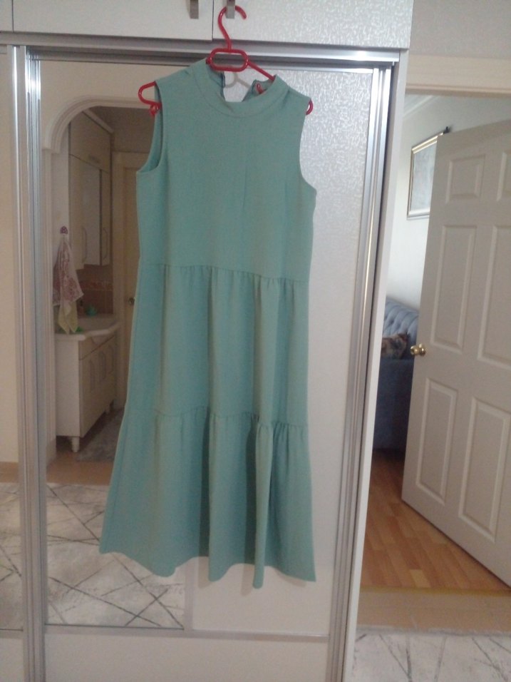 Yüksek yakalı, kolsuz ve bol kesimli turkuaz elbise, yumuşak ayrobin kumaş ve fırfır detaylarıyla günlük kullanıma uygun.