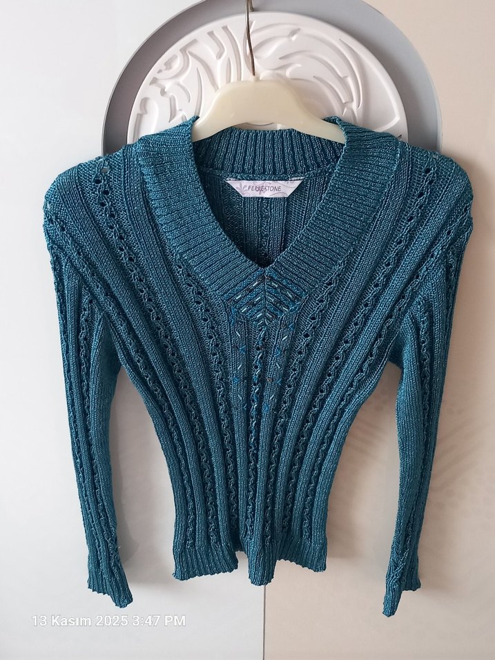 V yaka ve uzun kollu, turkuaz renkli, kısa kesim ve triko dokuma kadın kazak. Rahat ve bohem tarzıyla günlük kullanıma uygundur. Esnek bir kumaşı vardır bele çok güzel oturup vücudu güzelce sarar.