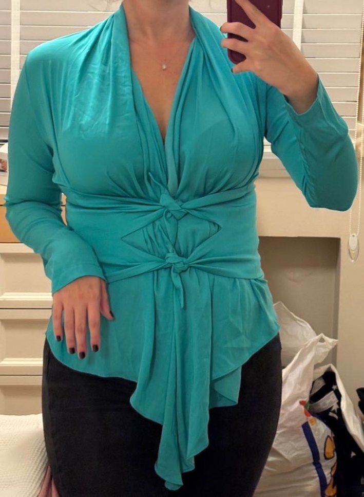 Turkuaz renkte, V yaka ve uzun kollu, vücuda oturan kesime sahip bu bluz, ipeksi dokusu ve drapeli tasarımıyla çağdaş bir görünüm sunar. Parlak yüzeyi ofis ve gece kullanımı için uygundur.