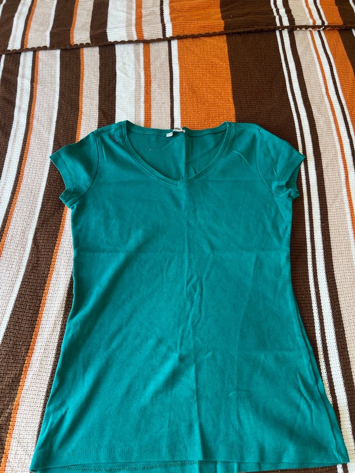 Kadınlar için turkuaz renkli, V yaka ve kısa kollu, vücuda oturan tişört. Yumuşak sentetik kumaştan üretilmiş, gündelik sokak stili için uygundur.