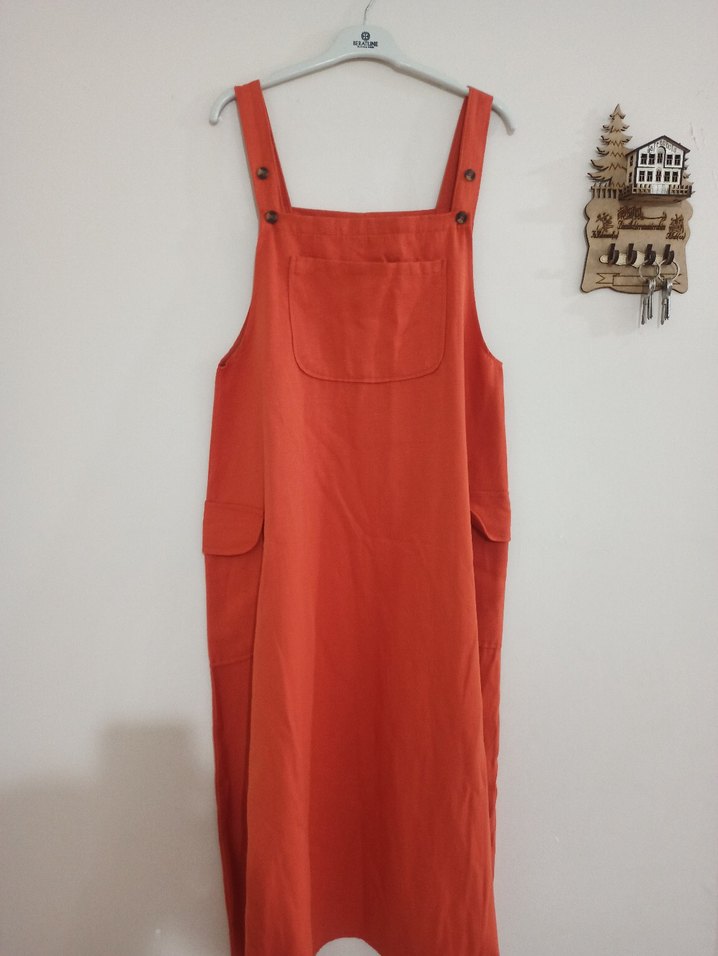 Kadınlar için askılı, bol kesim ve straplez yaka özellikli uzun tulum. Canlı turuncu renkte, sentetik kumaştan üretilmiştir. Rahat ve şık bir görünüm sunar.