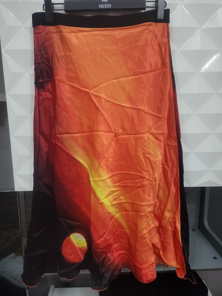 Kadınlar için turuncu tonlarda canlı bağlama desenli, satenimsi kumaştan, drapeli ve dar kesim uzun etek.