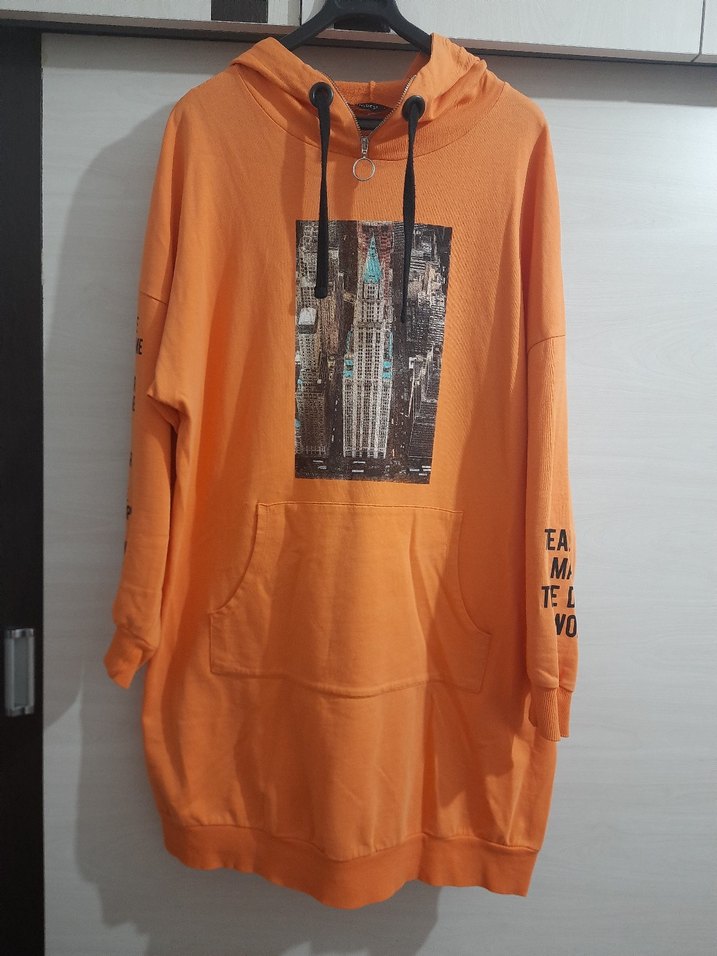 Kadınlar için turuncu kapşonlu, uzun kollu, baskılı şehir manzaralı sweatshirt. Bol kesim, cep detaylı ve günlük kullanıma uygun rahat pamuklu kumaştan üretilmiştir. iki koltuk arası 60cm boy 90cm dir.38 46 benler arası uygundur