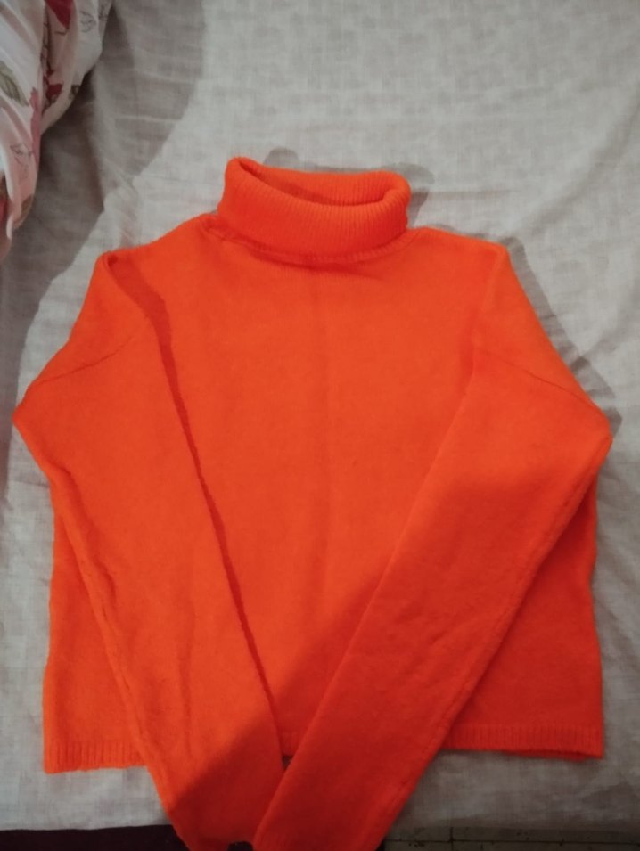 Kadınlar için boğazlı, uzun kollu, yumuşak dokulu turuncu triko kazak. Normal boyda, sade tasarımlı, günlük sokak stiline uygun.