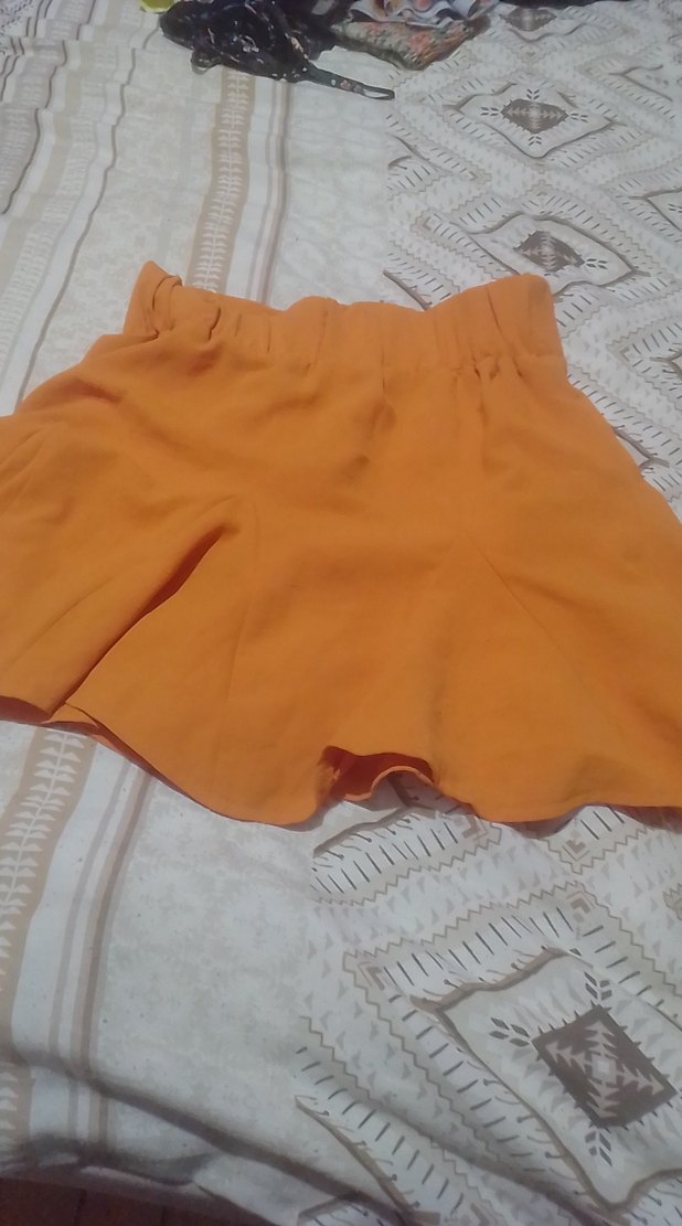 Parlak turuncu, yüksek bel, bol kesim mini şort, fırfırlı detaylı, ipeksi dokulu, günlük sokak stili için uygun.