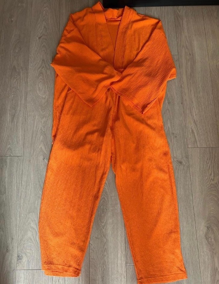 Kadınlar için turuncu renkli, Uzun kollu, V yakalı, bol kesim ve midi boyda, günlük kullanıma uygun şık bir model.