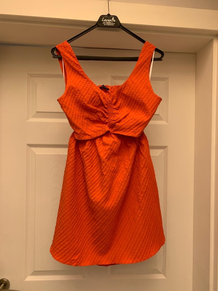Fitted kesim, keten kumaştan turuncu elbise, drapeli, kolsuz ve V yakalıdır. Midi boyda, romantik akşamlar için uygundur.