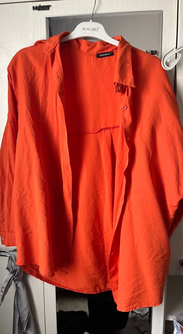 Parlak kırmızı keten gömlek, yakalı, uzun kollu ve düğmeli. Salaş kesimi ve midi boyuyla günlük rahat sokak tarzına uygun.