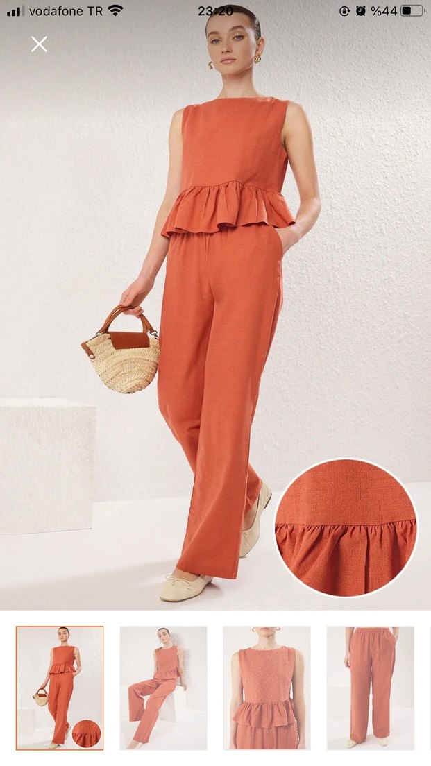 Kadın ikili takım , straplez yaka ve belde volan detayıyla dikkat çekiyor. Hafif turuncu keten kumaştan, normal kesim günlük kullanım için uygun. Kolsuz tasarımı rahatlık sağlar.