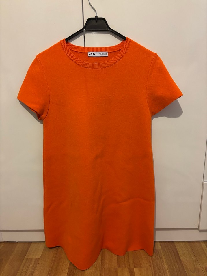 Kısa kollu, bisiklet yakalı, turuncu renkli, mini boy, vücuda oturan kadın triko elbise. Yumuşak sentetik kumaştan üretilmiştir, günlük kullanım için uygundur.