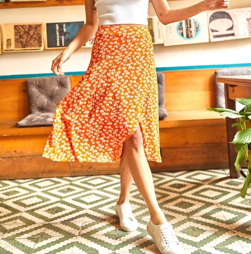 Renkli batik desenli, volan detaylı, bol kesim turuncu midi etek. Yumuşak sentetik kumaştan, günlük kullanıma uygun bohem tarzda.