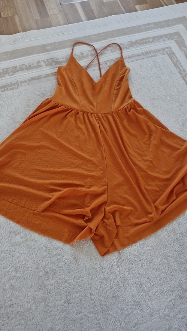 Kadınlar için bol kesim, parlak turuncu sentetik kumaştan yapılmış, drapeli ve V yakalı askılı kısa tulum. Bohem sokak stili için uygun.