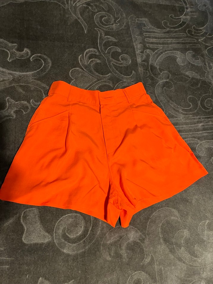 Parlak turuncu renkte, bol kesim ve ipeksi dokulu kadın mini şort.