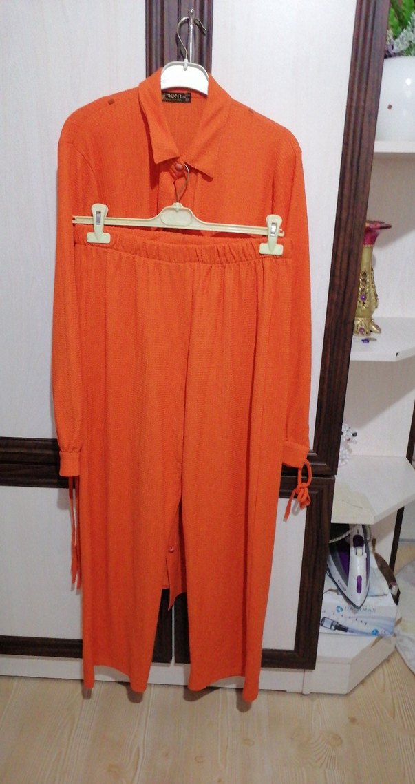 Kadınlar için uzun boy bol kesim turuncu kumaş pantolon takım Minimalist ve sade tasarımıyla günlük kullanıma uygundur. 44.46 beden arası yenidir hic geyinmedim sorunsuz pantalon uzunluk 1 metr koltukdan koltuga 50 st gömleyin uzunlugu 48.Markası fotraflararda