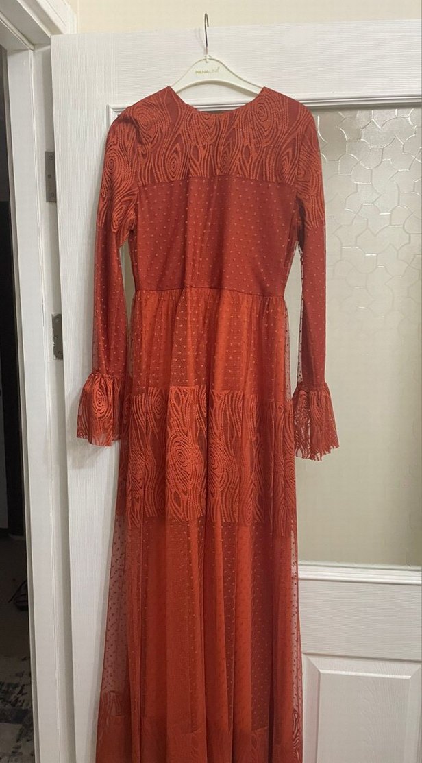 Turuncu, uzun, 38 beden, uzun kollu ve bisiklet yakalıdır. Tül ve ince kumaşı detaylarıyla şık bir tarz yansıtır. Günlük ve özel günler için uygun tesettür elbisesidir.