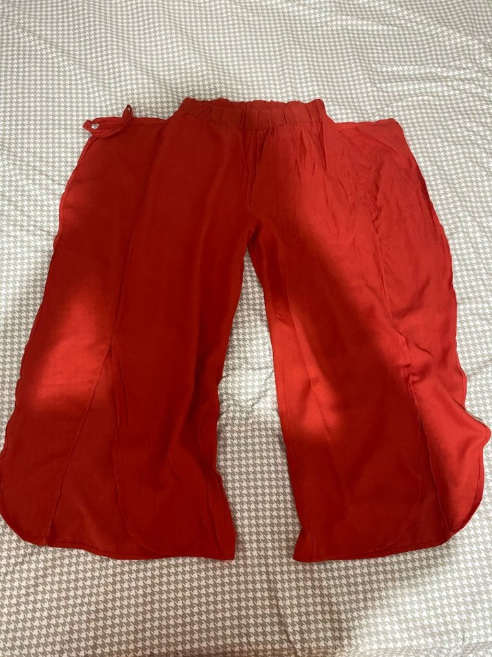 Salaş kesim, dokuma kumaştan, parlak görünümlü, dökümlü kadın pantolonu. Günlük kullanıma uygun, bohem tarzda.