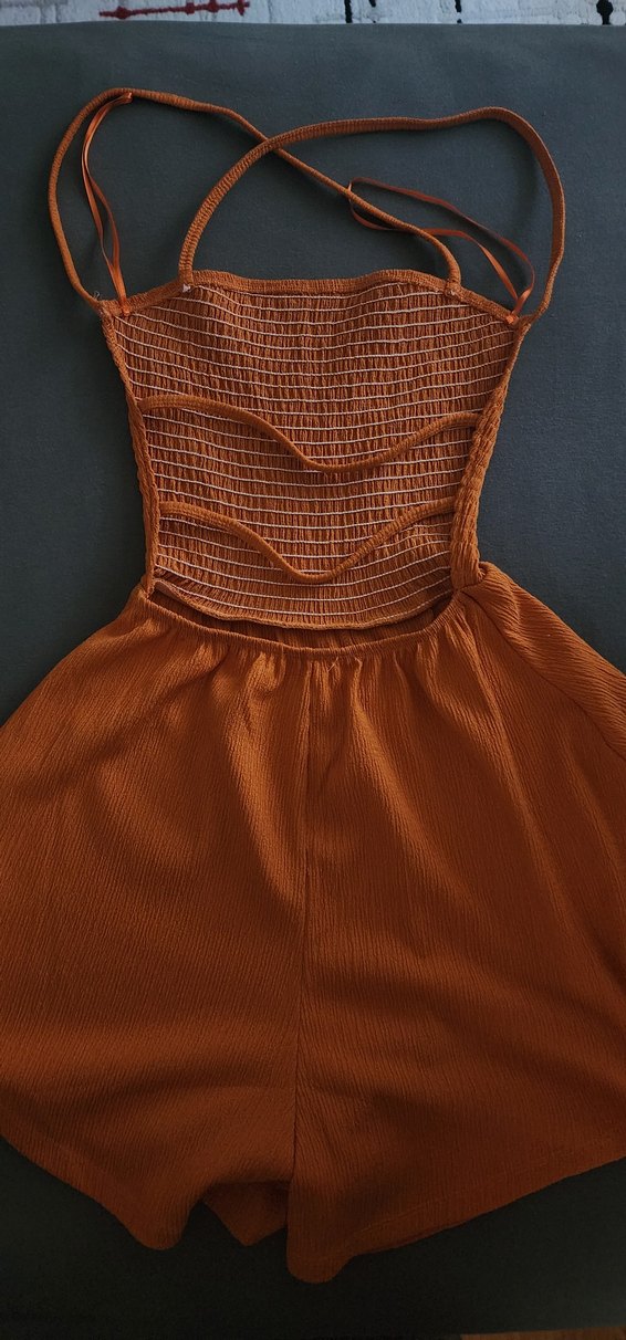 Turuncu straplez yaka ve ince askılı, pilili kumaştan, vücuda oturan midi tulum, minimalist ve şık tarz için uygun.
