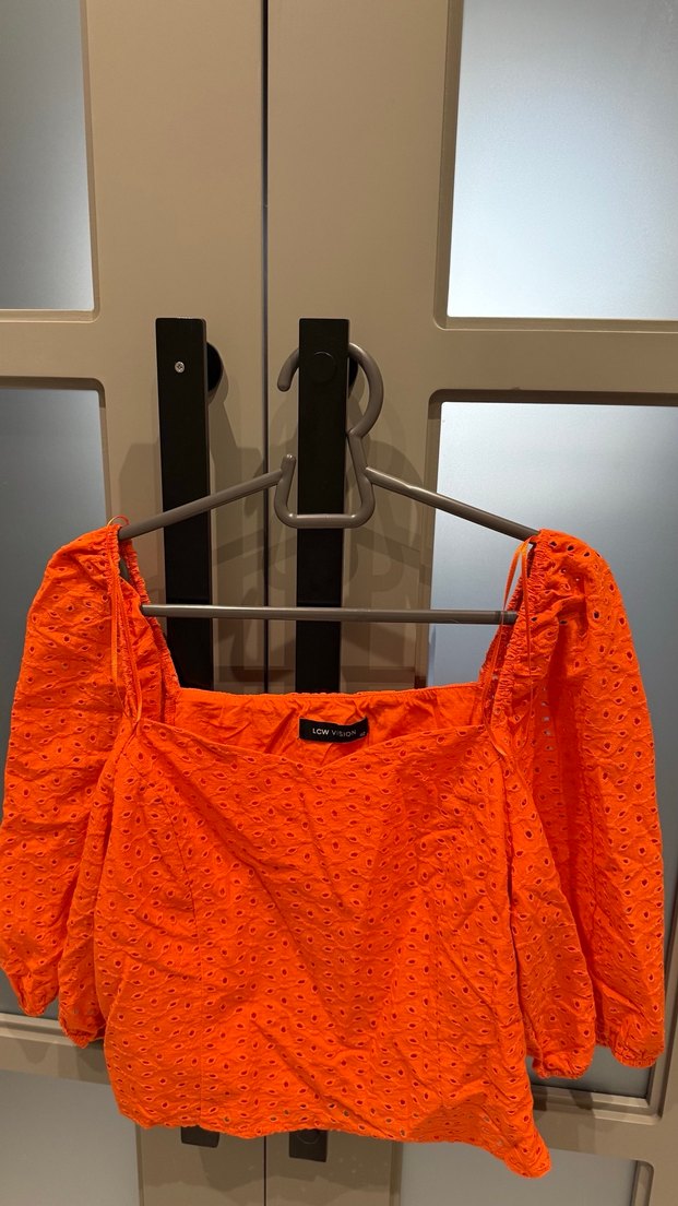 Turuncu renkli, uzun kollu, straplez yakalı ve bol kesim kadın bluz. Sentetik kumaştan, baskılı desene ve tokalı detaya sahip, günlük kullanıma uygun.