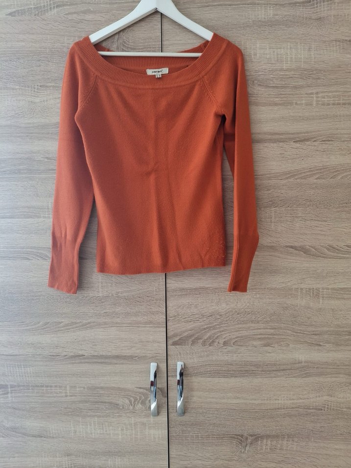 Turuncu kazak, uzun kollu ve kayık yaka detaylıdır. Modern ve zahmetsiz şıklık sunar, günlük kullanıma uygundur.