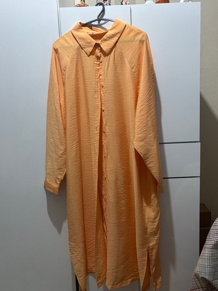 Kadınlar için uzun kollu, salaş kesim ve uzun boyda turuncu renkte sade ve desensiz bir elbisedir.