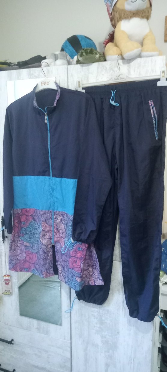 Kadınlar için bol kesim, uzun kollu ve yuvarlak yakalı eşofman takımı. Koyu mavi bağlama desenli ve fermuarlı detaylara sahip.beli lastikli boynu kapatan bonesi mevcut ♀️