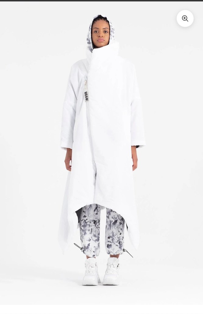 Uzun, bol kesim kadın puf kaban kapüşonlu, drapeli tasarıma sahip. Beyaz rengi ve avangart tarzıyla sokak modasına uygun. ️