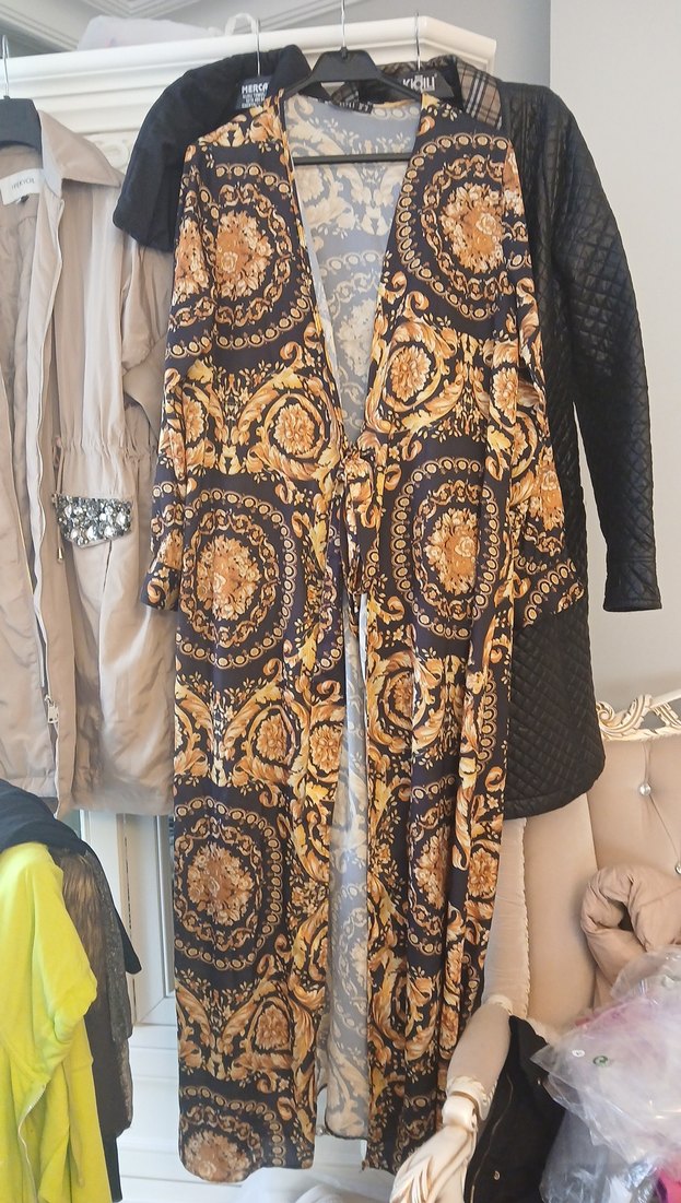 Kadınlar için uzun, bol kesim, koyu altın renkli desenli tekstil kimono. Uzun kollu, yaka detaylı ve drapeli bohem tarzda.