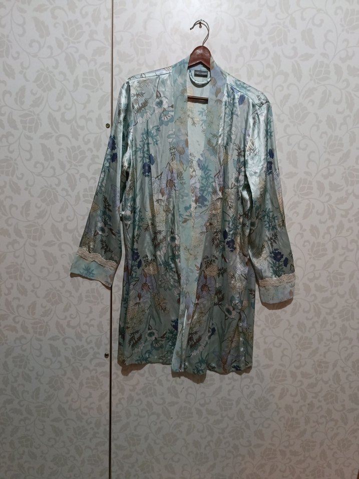 Kadınlar için uzun, bol kesim, uzun kollu, düğmeli kimono. İpeksi kumaştan, bohem tarzda gri-yeşil batik desenli, yakası çentikli, günlük kullanıma uygun. kemeri yok
