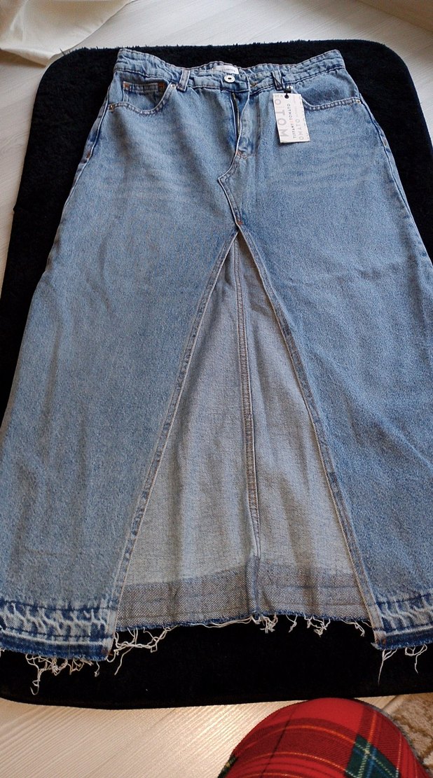 Kadınlar için uzun, bol kesim denim etek, önde yırtmaçlıdır. Bohem tarzı ve günlük rahatlığı bir arada sunar. Desensiz mavi kumaş, retro bir hava verir.